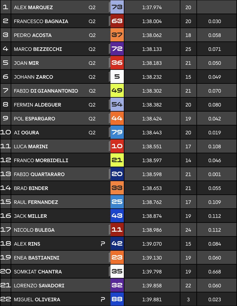 Se iba largo Quartararo en la cinco mientras Bezzecchi se ponía segundo y Pedro Acosta ya había conseguido arrebatar el mejor crono a Alex Márquez, que ahora era tercero. Pero todo se ponía tenso en los últimos minutos, cuando todos querían hacer su mejor vuelta. Mir estaba viniendo para ponerse primero, pero se colocaba tercero. Alex estaba arriba de nuevo, con Acosta segundo.