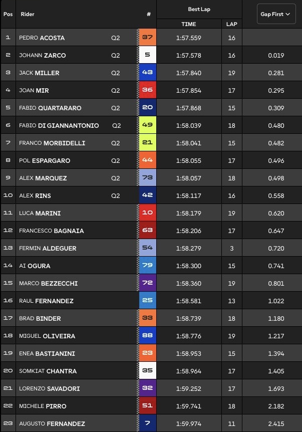 En el apartado negativo, Pecco Bagnaia no logró entrar en el corte: su mejor tiempo solo le permitió ser duodécimo, lo que le obligará a pasar por la Q1. La sesión concluyó con bandera a cuadros y un Top 10 final formado por: Acosta, Zarco, Miller, Mir, Quartararo, Di Giannantonio, Morbidelli, Espargaró, Marini y Rins (que sufrió una caída en los instantes finales).
