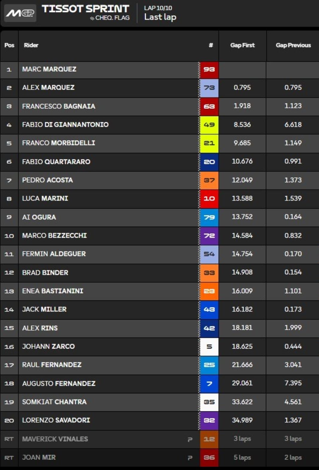 Marc Márquez suma y sigue. Consigue su quinta victoria de la temporada en su circuito fetiche. El podio vuelve a repetirse una vez más: Álex Márquez ha cruzado la meta en segunda posición, por delante de Pecco Bagnaia. El dominio de Ducati es apabullante, puesto que Fabio Di Giannatonio y Franco Morbidelli han terminado en cuarto y quinto lugar. El top five lo ha cerrado Fabio Quartararo con la Yamaha.
