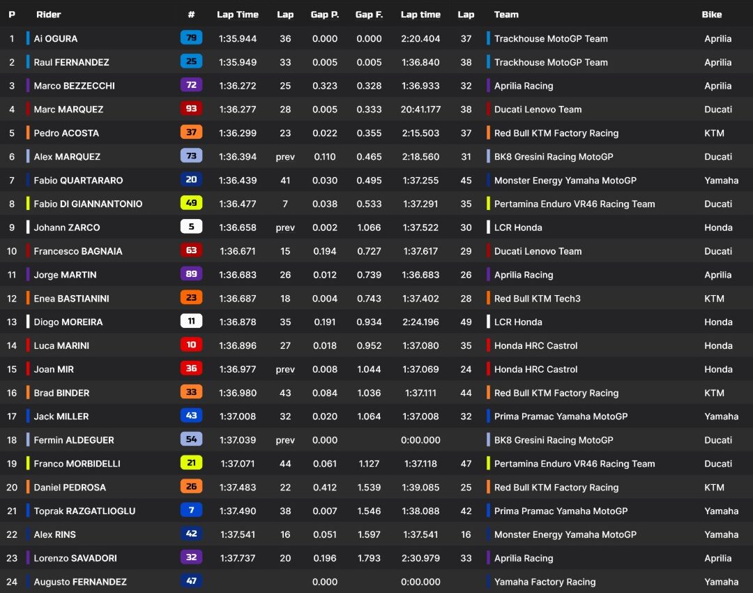 El broche lo ponía precisamente Fernández, que ha rebajado su registro hasta un magnífico 1:35.949, un tiempo muy sólido aunque todavía por detrás del récord absoluto de vuelta de Quartararo a temporada pasada. No obstante, los últimos minutos han sido lo más interesantes, con la mayoría de pilotos ya en el box y solo unos pocos como Di Giannantonio, Miller, Morbidelli y Pedrosa manteniendo algo de rodaje en pista.