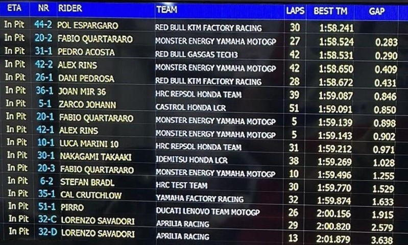 Una hora después, Fabio Quartararo daba un golpe sobre la mesa, mejorando su tiempo para colocarse segundo por delante de Pedro Acosta. Joan Mir lograba dar también un paso adelante, situándose sexto por detrás de Dani Pedrosa y Álex Rins. Johann Zarco sorprendía también situándose séptimo por detrás del mallorquín.