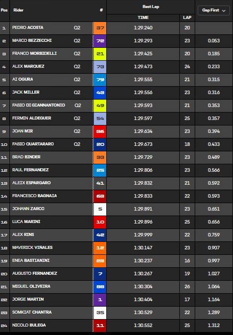 A falta de seis minutos para el final, la mayoría de los pilotos que estaban en box salían a pista para disputar los tiempos y tratar de obtener el pase directo a la Q2. Ogura se colocaba segundo, queriendo repetir lo de esta mañana, pero pronto Bezeecchi, Morbidelli y Alex Márquez le desplazaban hasta la quinta plaza. Terminaba la sesión, y finalmente Pedro Acosta era el más rápido, seguido de la Aprilia de Bezzecchi y a Ducati de Morbidelli.