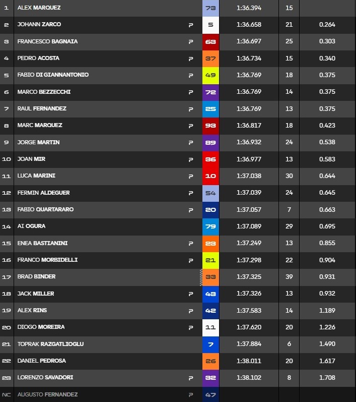 Finalmente, tan sólo había un cambio significativo en las primeras posiciones de la tabla al acabar la primera sesión de test de este lunes. Los tiempos de Alex Márquez y Johann Zarco permanecían imbatibles; pero Acosta era relegado a la cuarta posición por Pecco Bagnaia, quien marcaba un registro de 1:36.697. Di Giannantonio, por tanto, cerraba el Top5 de la clasificación, seguido por Bezzecchi, Raúl Fernández y Marc Márquez. Jorge Martín terminaba noveno; con Joan Mir ascendiendo al Top10 por delante de su compañero Luca Marini.