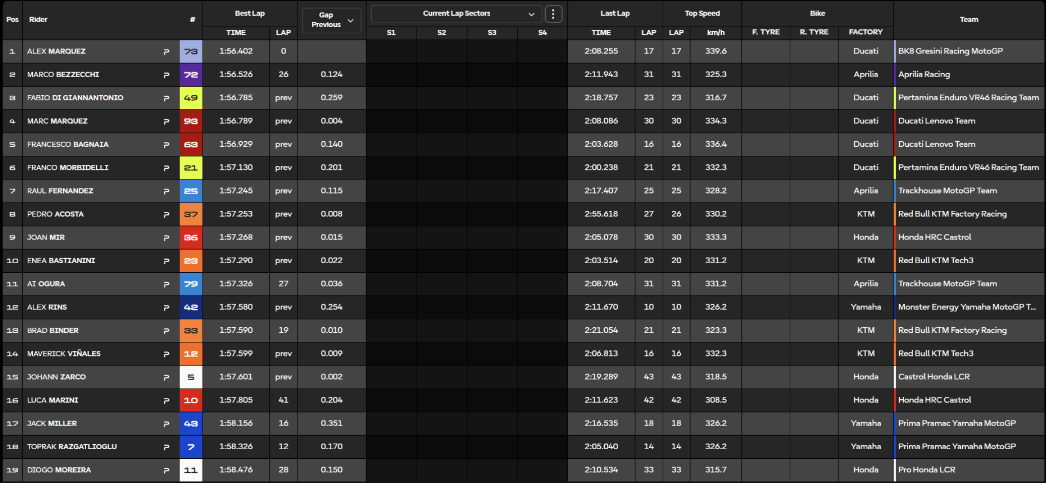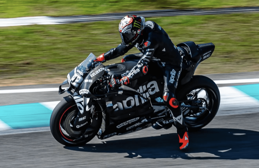 El piloto italiano de Aprilia voló en Sepang y paró el cronómetro en un espectacular 1:56.526, el mejor tiempo de toda la tanda vespertina. Su registro le permitió liderar la sesión de tarde, aunque no fue suficiente para batir el mejor tiempo absoluto del día, firmado por Álex Márquez por la mañana.