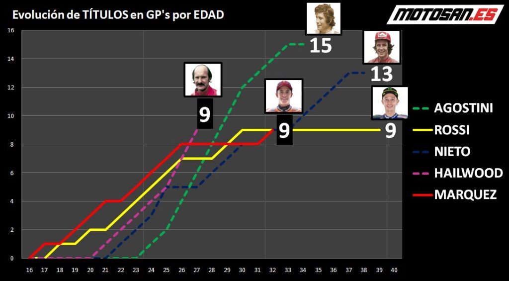 Valentino Rossi, Mike Hailwood y Marc Márquez comparten nueve títulos, pero cada uno los alcanzó siguiendo caminos muy distintos. Rossi los repartió a lo largo de una carrera larguísima y transversal a varias generaciones. Hailwood destacó por una versatilidad técnica extraordinaria, capaz de ganar en contextos y motos muy diferentes. Márquez, en cambio, los concentró en una primera etapa de su carrera marcada por un dominio inmediato.