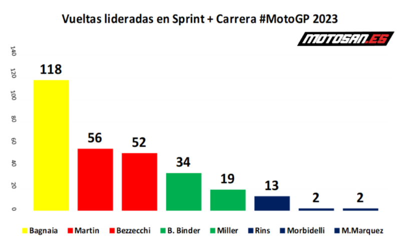 La primera mitad de la temporada de MotoGP ha estado marcada por la variedad. Pecco Bagnaia ha sido el único piloto capaz de destacar, tanto en las Carreras Sprint de los sábados como en las carreras largas de los domingos. No obstante, ha habido otros pilotos capaces de plantar cara e incluso vencer al Campeón del Mundo. El nuevo formato de MotoGP ha dado la oportunidad a los pilotos de brillar en situaciones más explosivas; como ha sido el caso de Jorge Martín o Brad Binder. Marco Bezzecchi es otro de los grandes nombres de la temporada, tras haber dado un gran paso adelante con respecto al año pasado. No obstante, estos no han sido los únicos pilotos capaces de liderar una carrera.