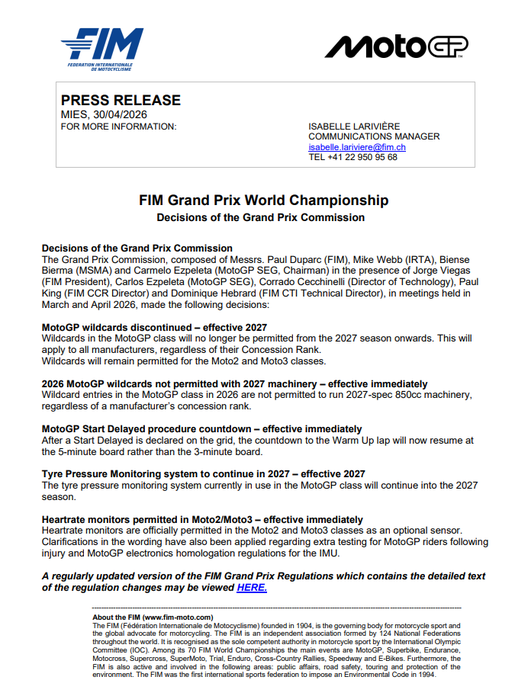 Según el comunicado oficial publicado por MotoGP, desde la temporada 2027 ningún fabricante podrá inscribir pilotos invitados en MotoGP, independientemente de su estatus dentro del sistema de concesiones. Esta decisión supone un cambio importante en la filosofía del campeonato.