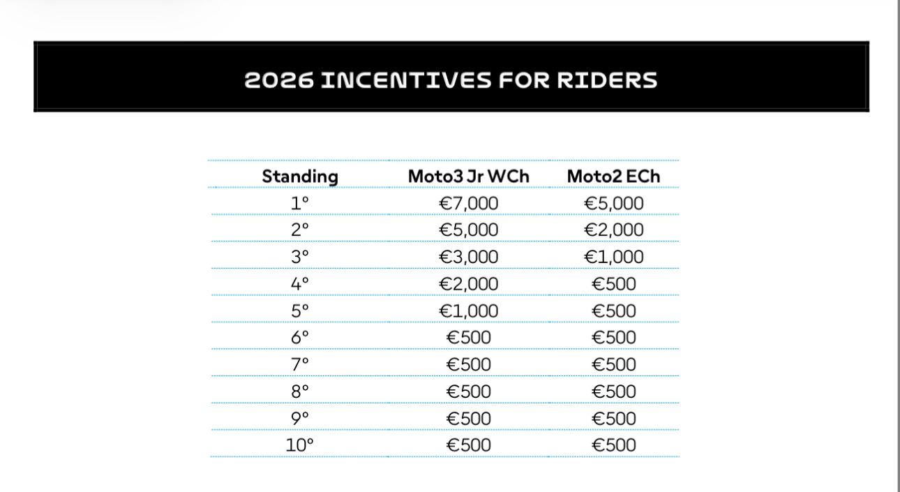 - Incentivo 1: 200.000€ para el equipo cuyo piloto gane el Campeonato Mundial Junior de Moto3 y consiga al menos cuatro victorias.