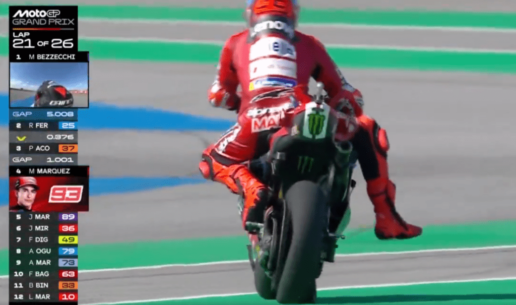 Por otra parte, Marc Márquez, que ha sucumbido durante toda la carrera a la cuarta posición, viéndose superado por las Aprilias y por la KTM de Acosta, no ha podido terminar la carrera. A falta de seis vueltas para el final, Marc se estaba acercando a Raúl Fernández y Acosta que iban segundo y tercero respectivamente, pero un llantazo al ir largo en una curva ha dejado a Marc con el neumático pinchado y desencajado. En el vídeo que ha publicado DAZN en sus redes sociales del momento, se ve como Marc se sale de la pista y el neumático se desencaja de la llanta, viéndose una torcedura en esta.