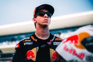 Pedro Acosta termina la carrera tercero, después de las caídas de los pilotos de delante: «Bueno, a ver, al final desde la qualy iba a ser duro batir a las Aprilia y a las Ducati. Pero hemos hecho un buen trabajo, se está trabajando muy bien y tenemos que estar contentos«. Pecco Bagnaia ha perdido la carrera en la última vuelta y ha bromeado con eso diciendole ‘jodido bastardo’ al ganador en un tono de risa: «La verdad es que estaba tratando de ser suave y, después de la primera vuelta donde he empujado a tope, estaba llegando al final tratando de guardar el neumático. Me empezaba a costar mucho y deslizaba demasiado de la parte trasera, pero en cualquier caso estamos muy contentos con el trabajo que estamos haciendo. Nos merecíamos muchísimo este tipo de carrera y de resultados. Así que gracias al equipo, que siempre trabaja duramente, y mañana daremos otro paso más adelante«.