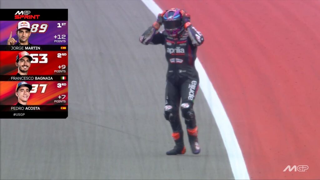 Jorge Martín, a pesar de la caída en su celebración ha agradecido al equipo esa victoria y ha mostrado su euforia tras volver a ganar una sprint desde el año en el que fue campeón: «Súper contento. Muchas gracias a todos, es la primera vez que consigo una victoria aquí en MotoGP. Y es fantástico, ha sido increíble. Dudaba un poco con el neumático medio, pero sabía que era el bueno y ha rendido sus frutos al esperar a la última vuelta. Nunca he ganado una carrera así, y menos una sprint, pero volver a ganar una sprint significa mucho para mí. Gracias a Aprilia, que es un gran equipo; me están ayudando muchísimo para encontrar mi nivel y estamos llegando ahí«.