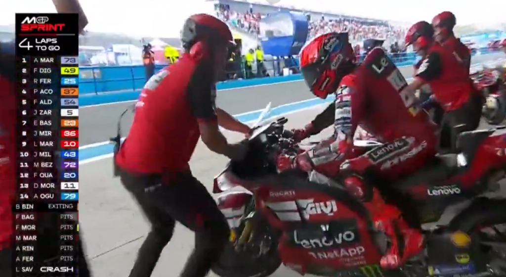 Hace apenas unos minutos que ha terminado una carrera al sprint completamente loca en el circuito Ángel Nieto de Jerez. Marc Márquez se ha hecho con la victoria después de que le haya pasado de todo. Cuando iba segundo en la carrera detrás de Alex Márquez, que posteriormente ha caído, y con la lluvia ya presente en el circuito, se ha ido al suelo. A pesar de todo, ha tenido la suerte de estar cerca del pit lane y rápidamente ha cruzado la recta de meta, para entrar en boxes y cambiar la moto a mojado. El segundo clasificado ha sido Pecco Bagnaia que antes de entrar a pit lane rodaba el decimocuarto, partiendo desde la décima posición, un segundo puesto cosechado después de adelantar primero a Aldeguer y después sucumbiendo a la presión de Márquez. Morbidelli, también ha subido al podio después de quedar por delante de su compañero, estando inicialmente al fondo de la parrilla.