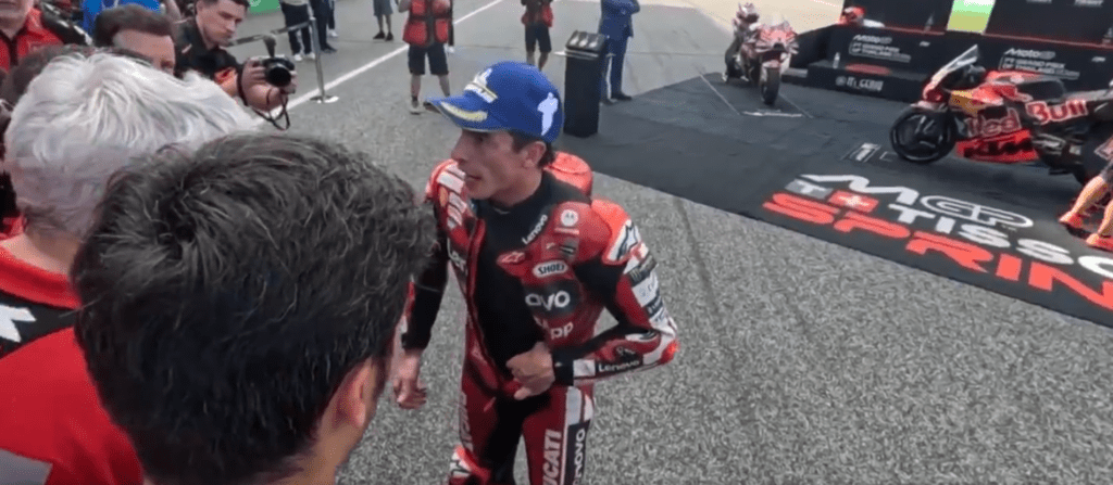 En una conversación, justo después de bajarse de la moto, con Gigi Dall’Igna, Davide Tardozzi i Marco Rigamonti, entre otros miembros del Ducati Lenovo, ha explicado su versión de lo ocurrido. «¡Estaba delante!«, ha repetido múltiples veces el piloto entre el italiano y el castellano. De hecho, ha explicado a sus jefes que la posición ya la tenia ganada aunque se hubiera abierto en la curva: «Si el me hubiera adelantado y yo le empujo fuera, me hubiera ido afuera yo también«. «Estaba en pista y el contacto ha sido cuando estaba delante«, ha incidido Márquez.