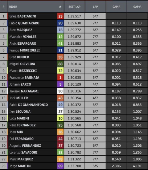 Ya en las últimas vueltas de la prueba, los pilotos han continuado mejorando sus registros; aunque sin muchos cambios. El único que ha logrado sacar petróleo de su moto ha sido Fabio Quartararo; que aunque mejoraba en los dos primeros sectores, no podía superar el 1:29.517 de Bastianini. Las Aprilia han seguido en su línea este fin de semana, con Maverick Viñales y Aleix Espargaró en cuarto y quinto lugar.