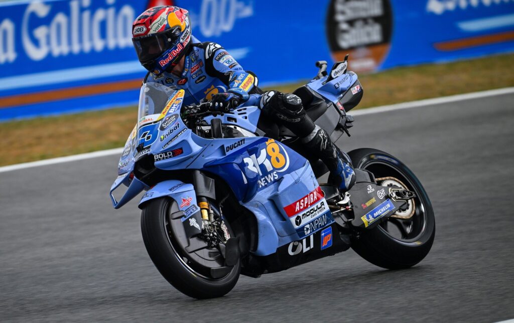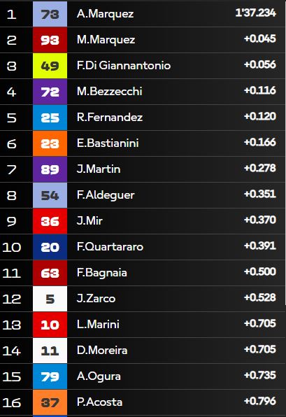 La jornada del sábado en el Circuito de Jerez – Ángel Nieto dejó tras de sí una Sprint caótica marcada por la lluvia. Marc Márquez fue el gran triunfador del día, logrando la victoria tras sufrir una caída a pocos metros del pit lane; lo que le permitió entrar rápidamente a cambiar la moto por la de lluvia. Pecco Bagnaia subió al podio en segunda posición; mientras que Franco Morbidelli fue tercero.