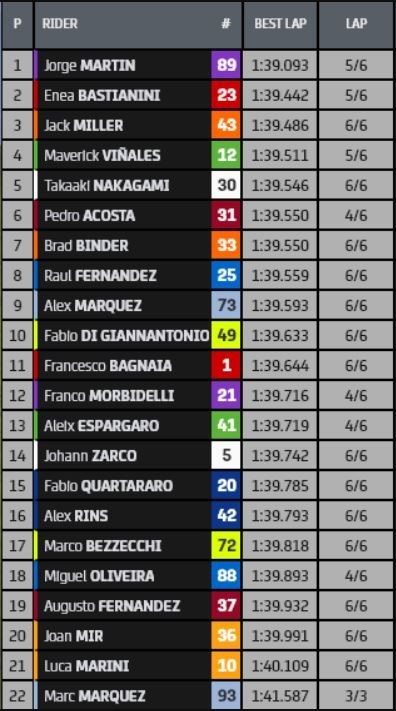 De vuelta a la pista, Jorge Martín ascendía hasta la primera posición, seguido por Enea Bastianini y Jack Miller en la tercera posición. Viñales se situaba cuarto; con Nakagami dando un paso adelante para situarse quinto. Pedro Acosta, por su parte, terminaba sexto, seguido por Brad Binder y Raúl Fernández; que ascendía hasta la octava posición en el último suspiro. Bagnaia y Espargaró se quedaban fuera del Top10; mientras que Joan Mir y Luca Marini ocupaban nuevamente las últimas posiciones de la tabla. Marc Márquez ni siquiera marcaba tiempo.