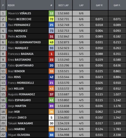 En el último suspiro de la sesión aparecía Raúl Fernández para marcar el mejor tiempo. Sin embargo, el madrileño se veía superado por Maverick Viñales y Bezzecchi en el último paso por meta. Alex Márquez ha terminado la primera sesión del domingo en cuarto lugar seguido por el rookie Pedro Acosta, que continúa demostrando su talento en la categoría reina. Marc Márquez ha terminado séptimo por delante de Pecco Bagnaia. Jorge Martín, por su parte, ha sido décimo séptimo.
