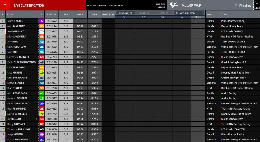 Oliveira también lograba hacer un gran tiempo, situándose cuarto. Álex Rins ha logrado terminar quinto, con Cal Crutchlow volviendo a colarse en el Top10 en el sexto lugar.