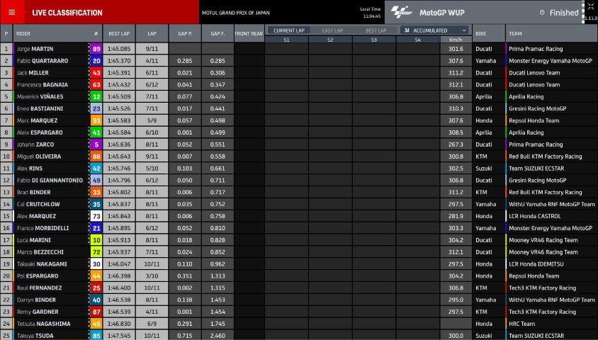 El pequeño de los Espargaró, afortunadamente, no sufría graves consecuencias tras su caída, y podía regresar a la pista. Mientras tanto, el líder del Campeonato, Fabio Quartararo, se afianzaba en el primer lugar de la clasificación, marcando la referencia en la categoría reina.