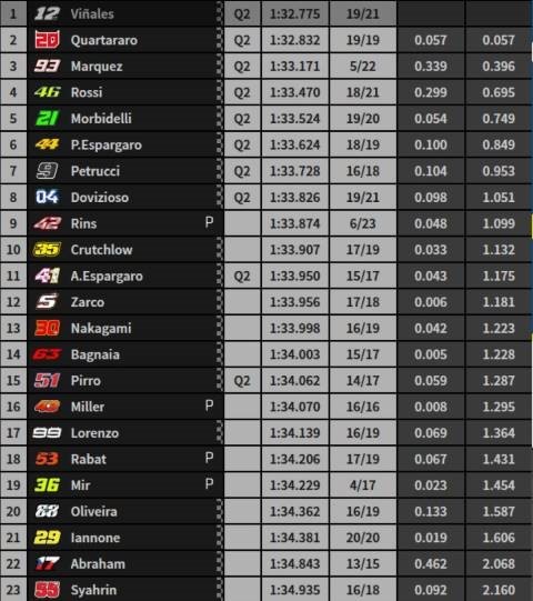 Con los neumáticos más blandos, todos han lanzado su ataque y Maverick Viñales ha sido finalmente el más rápido del día, seguido de Quartararo a 57 milésimas. Tercero Márquez a 396 milésimas. Ya a más de medio segundo nos encontramos a las otras dos Yamaha, Rossi y Morbidelli. Sin duda la Yamaha es la moto a vencer en la cita de Misano, mientras que las Ducati oficiales quedan más atrás. Petrucci séptimo, Dovizioso octavo. Rins, tras su gran victoria en Silverstone noveno. Crutchlow, con Honda, cierra el top ten. Lorenzo ha mejorado sus prestaciones, acabando en 17ª posición.