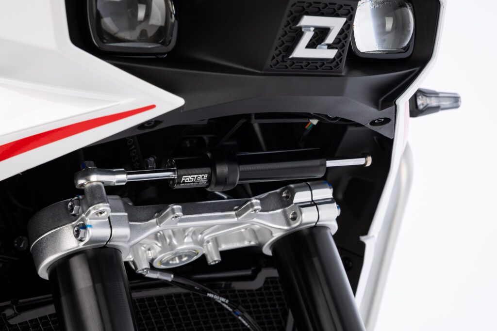 En el sistema de frenos se ha optado por doble disco delantero con pinzas axiales Taisko de doble pistón, gestionado por un sistema ABS Bosch Cornering que optimiza la estabilidad incluso en apoyo. Para el eje trasero, el sistema se simplifica a un disco lobulado con pinza Taisko de un pistón. Como buena Trail, no podían faltar las llantas de ratios Tubeless equipadas con neumáticos CST Ride Ambro A3.
