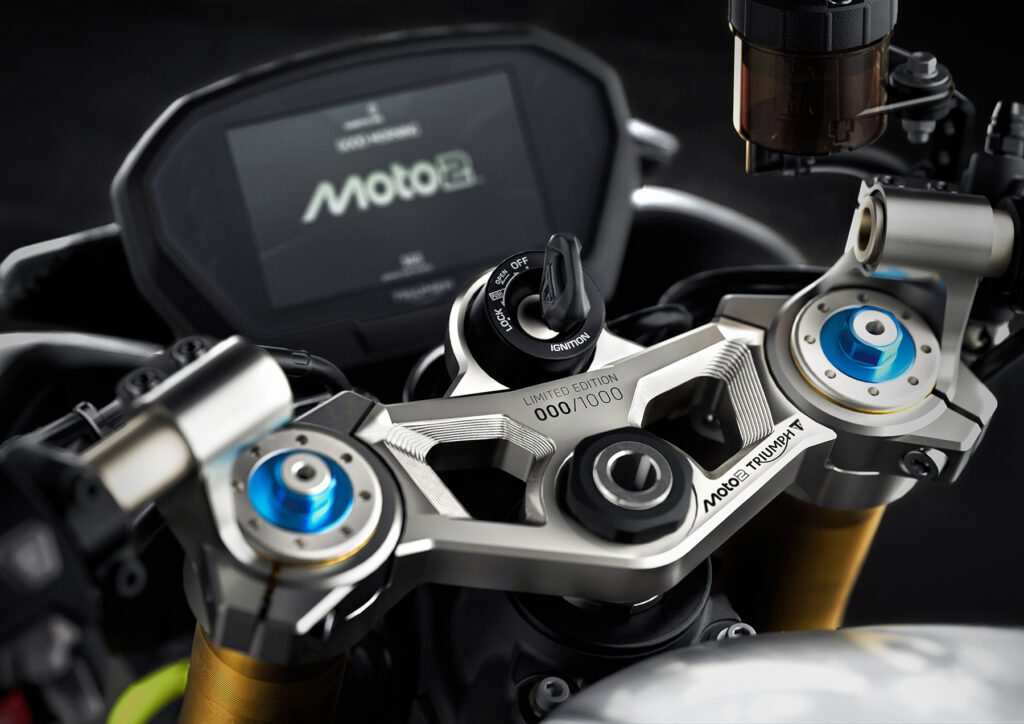 Equipadas con un completo paquete de ayudas electrónicas orientadas a ofrecer mayor confianza y control, las nuevas Street Triple 765 RX y Moto2 Edition incorporan una pantalla TFT a color de 5 pulgadas con una interfaz intuitiva y de fácil lectura. La Moto2 Edition añade, además, un mensaje de inicio personalizado con el logotipo Moto2, un detalle que refuerza su vínculo con la competición y acompaña a la tija mecanizada y numerada de cada unidad.
