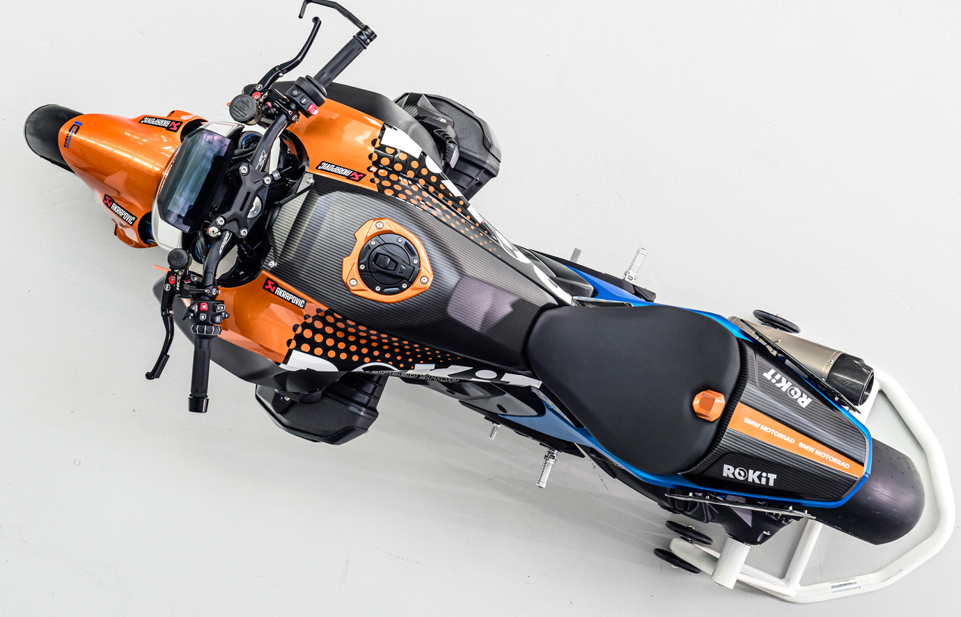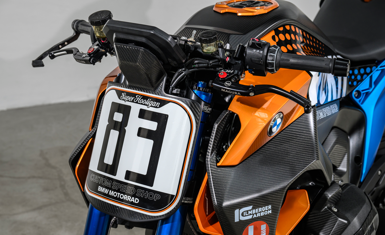 Los homenajes a la victoria de Steve McLaughlin en Daytona hace 50 años se reflejan no solo en el número de salida 83 de la Superhooligan, sino también en los componentes pintados con el color de la BMW R 90 S de la época, incluidos los guardabarros delanteros y los paneles laterales del depósito. A juego con esto, el azul utilizado en las pinzas de freno de la BMW M 1000 RR también aparece en el bastidor trasero de aluminio y en los tubos de horquilla fijos de la horquilla delantera invertida Wilbers totalmente ajustable, que se ha alargado 30 mm para aumentar el ángulo de inclinación. El muelle del amortiguador Wilbers totalmente ajustable también tiene un acabado en un tono azul a juego.