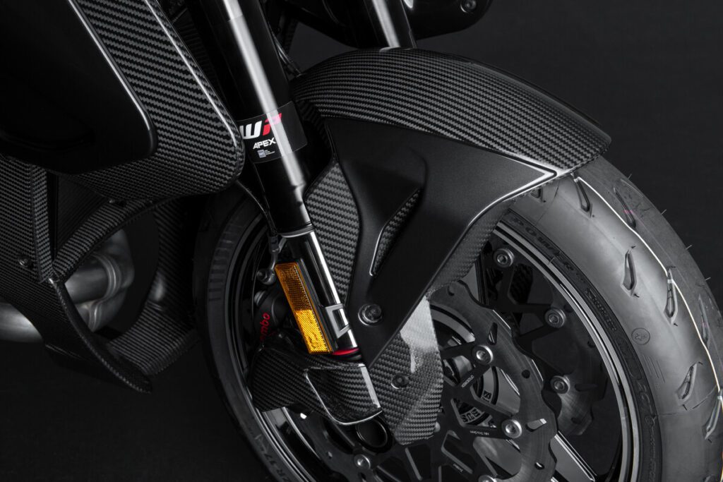 En esta moto, los ingenieros de BRABUS optaron por el diseño BRABUS Monoblock II EVO “PLATINUM EDITION” con un diámetro de 17 pulgadas. En homenaje a uno de los diseños de llantas más emblemáticos de la larga historia de la empresa y fabricadas mediante el uso de tecnología de forjado y mecanizado de última generación, su estructura ligera de tres brazos optimiza la estabilidad y el comportamiento dinámico, lo que garantiza que esta Luxury Hyper Naked tome las curvas con una precisión milimétrica. Otros elementos de fibra de carbono con estructura expuesta, como la cubierta de la rueda trasera, la cubierta del basculante y el protector de cadena, complementan el amenazador aspecto.