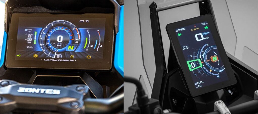 La VOGE, por su parte, comparte la mayoria del equipamiento de la Zontes 703F, pero prescinde del cambio rapido, el sistema keyless, la cúpula ajustable electricamente y la camara HD trasera (solo lleva cámara en el frontal). A cambio, la pantalla tiene un mayor tamaño (7″) y una disposición vertical. Además, incluye en su equipamiento de serie el asiento calefactado.