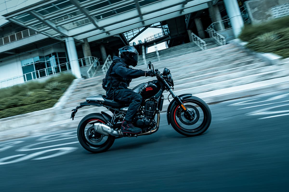 Royal Enfield también dice adiós a los neumáticos mixtos, pasando a calzar unos neumáticos Vredestein Centauro ST más anchos y con mayor agarre. El carácter deportivo se complementa con una estética donde desaparecen los fuelles de suspensión y se añade una pequeña cúpula frontal, un colín trasero y cintas en las llantas.