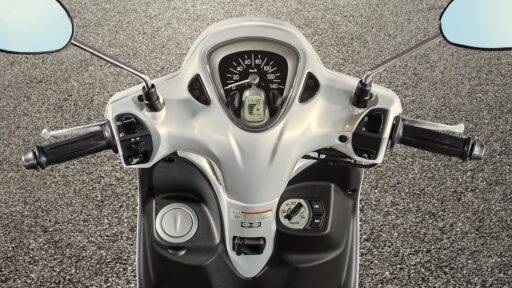 Pesa únicamente 101 kg con el depósito lleno y se desenvuelve con bastante agilidad gracias también a sus pequeñas ruedas, de 12″ delante y 10″ detrás. El resto de los elementos de la parte ciclo son bastantes sencillos, con un disco delantero y tambor trasero en el apartado de frenos, con un sistema de frenada combinado. Una horquilla telescópica y un sencillo amortiguador forman el sistema de suspensiones.