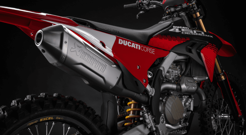 Este ahorro se logra gracias a las pletinas de dirección mecanizadas y al sistema completo de escape Akrapovič Titan, que por sí solo reduce el peso en 1,7 kg. Según Ducati Official, este sistema (combinado con un mapeo específico) optimiza la entrega de potencia en el rango bajo y medio, crucial para ganar tracción en el exigente terreno de los 450 cc.