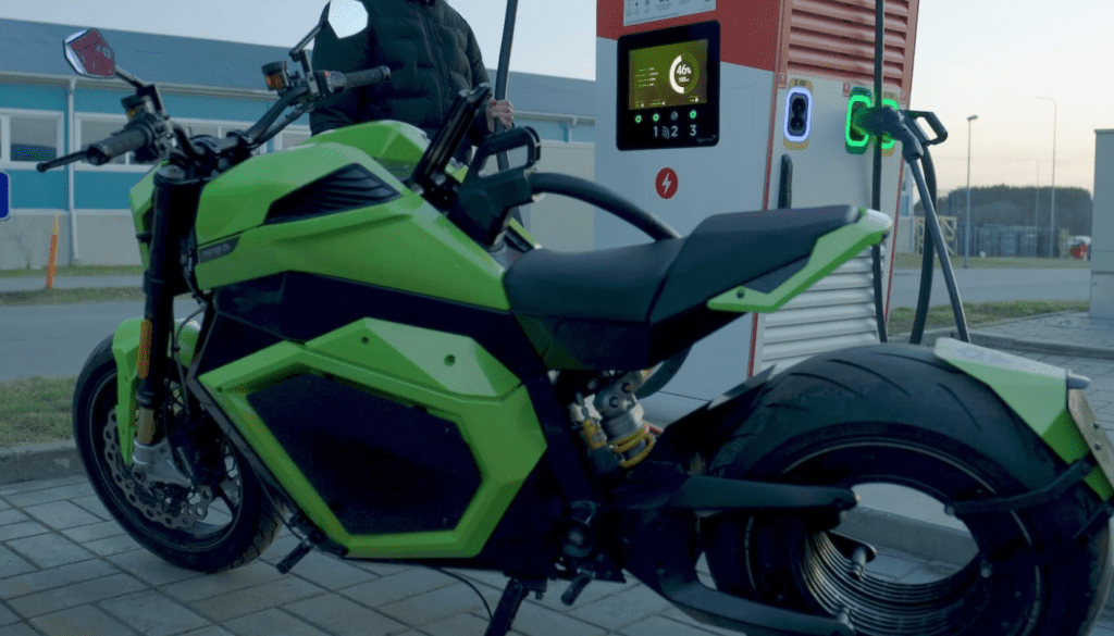 La prueba realizada sobre la TS Pro de Verge demuestra que la carga rápida anunciada por Donut Lab es una realidad. Con una capacidad nominal de 18kWh y conectada a un cargador rápido público, la moto logró mantener un pico de potencia de carga de más de 100 kW (tasa de carga de 5C) durante los primeros cinco minutos.