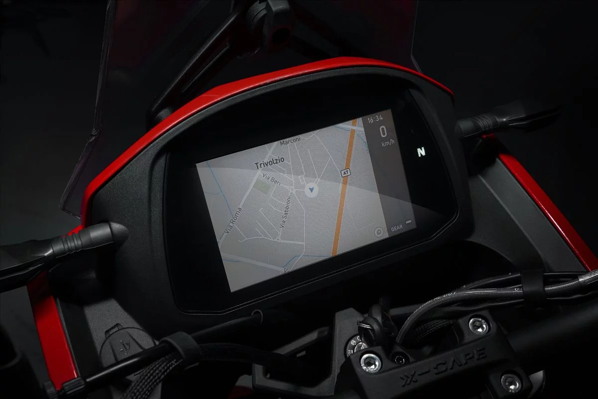La experiencia del usuario se centraliza en una inmensa pantalla TFT de 7 pulgadas, una de las más grandes del segmento, que ofrece conectividad Bluetooth completa, navegación integrada y hasta control de presión de neumáticos. Las piñas retroiluminadas son un toque premium que marca la diferencia en conducción nocturna.