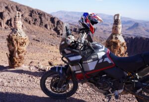 Las líneas del guardabarros delantero se conectan visualmente con las de las cubiertas laterales y las alforjas, creando un efecto de fluidez. Vista de perfil, la motocicleta parece estar en movimiento. La combinación de colores parte de una base de pintura Vivid Black. Cada panel está diseñado con sombras interiores y un sutil patrón de Bar & Shield que se desvanece a lo largo del diseño.