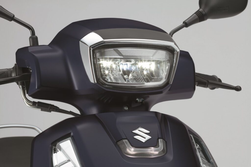 A primera vista, el nuevo Address conserva el estilo clásico pero con pequeños cambios. Las líneas son más marcadas, incorporando detalles en cromado y un nuevo faro rectangular LED acompañado de una luz de posición en forma de U bajo el logo de Suzuki. La parte trasera, coronada por el asa para el pasajero, mantiene esta línea, culminando en un faro también LED.