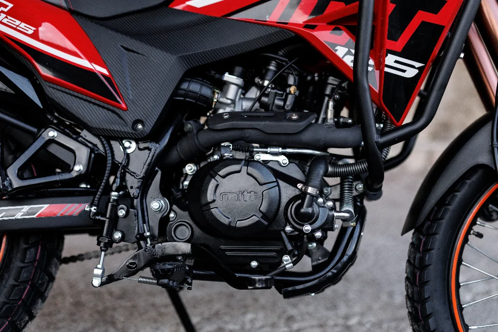 La MITT MT 125 es el producto más reciente de la marca para quienes buscan una moto robusta, ágil y capaz de enfrentarse a cualquier meto, por complicada que sea la ruta. Su motor es un moderno monocilíndrico de cuatro válvulas alimentado por inyección electrónica BOSCH y refrigerado por liquido. Esta combinación tecnológica consigue ofrecer el máximo de potencia permitida para el carné A1: 15 CV (11) kW) y un par motor de 11,5 Nm a 8.000 rpm, rendimiento que se traslada a la rueda trasera mediante un cambio de marchas de seis velocidades.
