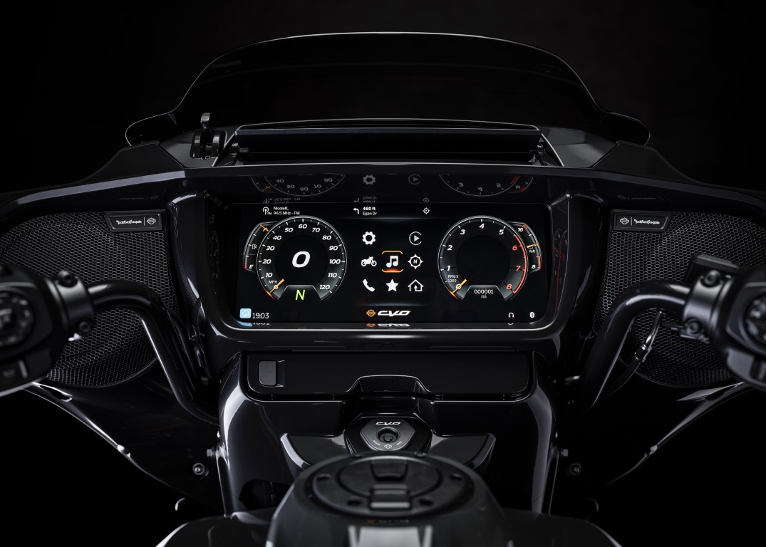 La CVO Street Glide eleva el equipamiento tecnológico al nivel de los automóviles más modernos. Equipa el sistema operativo Skyline OS, gestionado a través de una pantalla táctil TFT de 12,2” que ofrece navegación GPS, conectividad Wi-Fi, soporte para comandos por voz, Android Auto y Apple CarPlay.