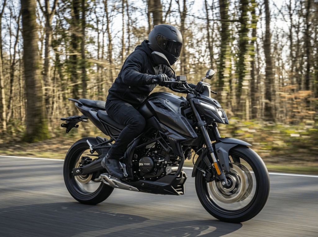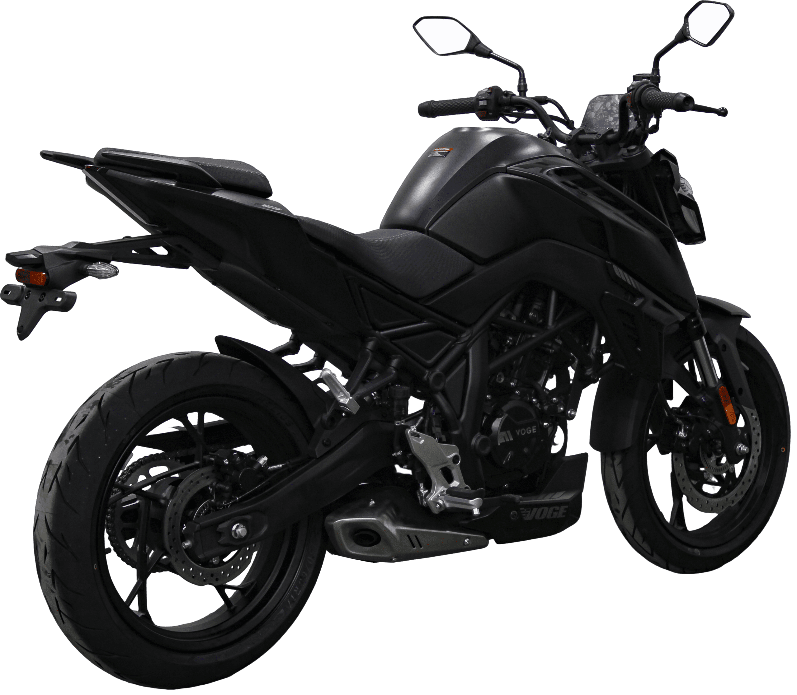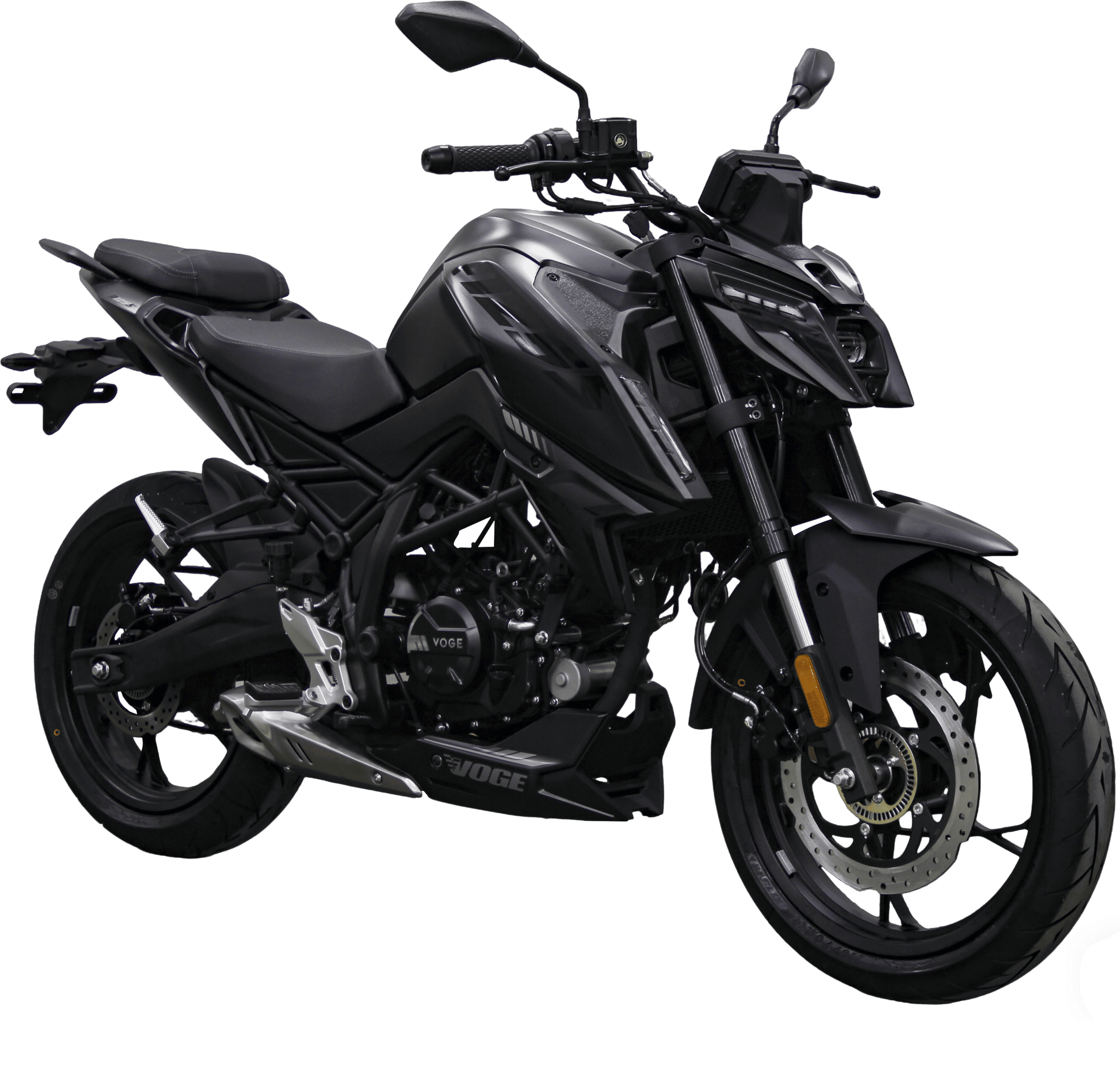 En materia de seguridad, la nueva naked de Voge equipa frenos de disco en ambos ejes, con un disco delantero de 300 mm accionado por una pinza de doble pistón y un disco trasero de 220 mm. El sistema está asistido por ABS, que evita el bloqueo de las ruedas en frenadas bruscas, y por control de tracción TCS completamente desconectable, que ayuda a mantener la estabilidad en superficies de baja adherencia o en condiciones meteorológicas adversas. El conjunto se completa con llantas de aleación con neumáticos tubeless, en medidas 110/70-17 en la rueda delantera y 150/60-17 en la trasera, una combinación que favorece la estabilidad y el agarre en curva, reforzando el carácter deportivo del modelo.