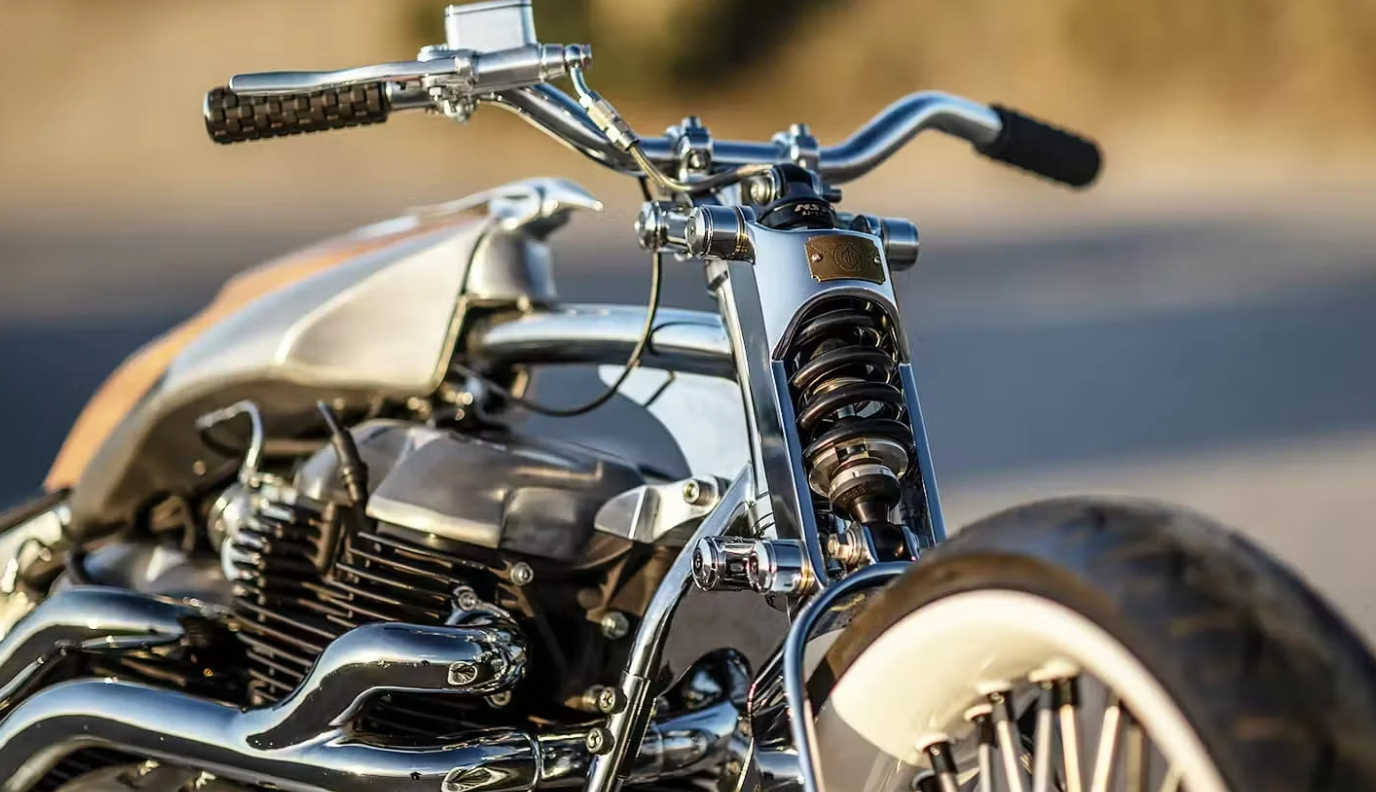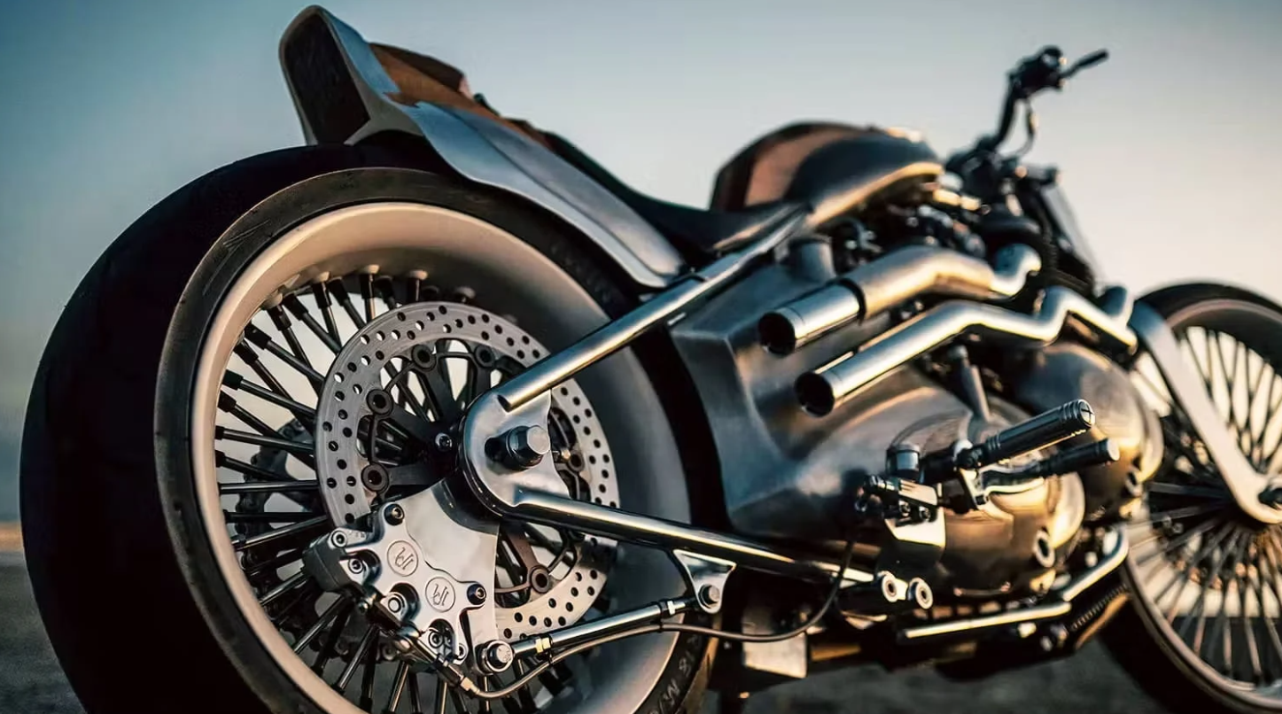 Para soportar el empuje de ambos motores, el chasis original cedió su lugar a un bastidor rígido de acero fabricado a medida, complementado por una horquilla delantera tipo Girder que conecta con la estética de antaño. Sus ruedas de 26 pulgadas delante y 18 detrás (con componentes de Performance Machine y Neo Factory) otorgan una presencia imponente.