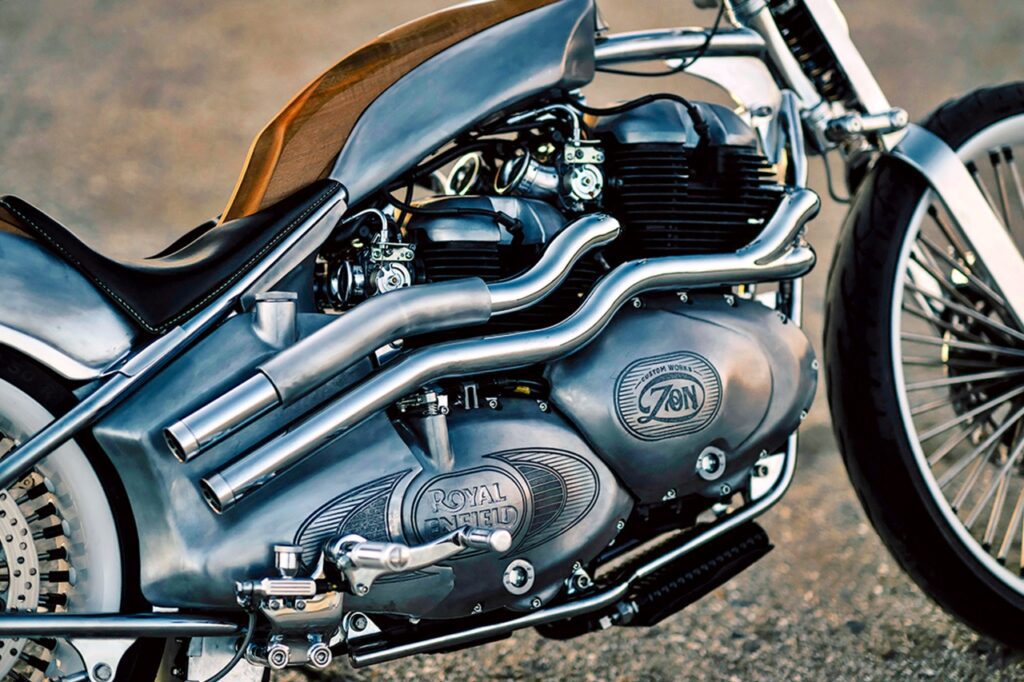 Aunque la base es una Royal Enfield Classic, el protagonismo recae en su audaz configuración mecánica: dos motores bicilíndricos paralelos de 650 cc alineados para funcionar como uno solo. El bloque delantero prescinde de la transmisión y ve su cárter recortado para acoplarse estrechamente al trasero, que sí conserva la caja de cambios. Conectados mediante una cadena de transmisión primaria, ambos cigüeñales giran al unísono.