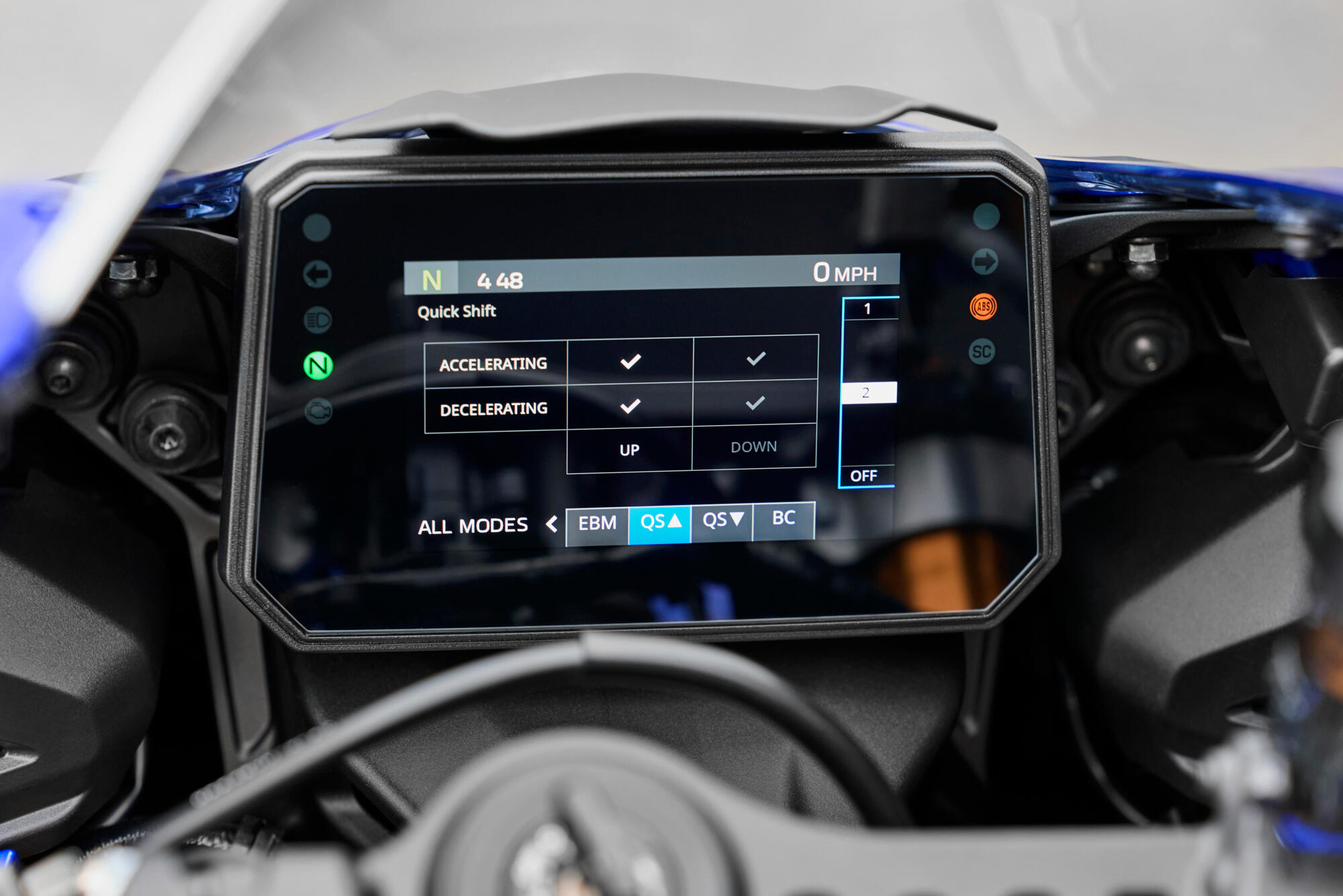 La experiencia general del cambio de marchas mejora aún más con la introducción de la tercera generación del cambio rápido Quickshifter (QSS) de Yamaha, que permite subir y bajar de marcha sin embrague mediante diferentes configuraciones. El ajuste 1 permite subir de marcha sin embrague al acelerar y bajar de marcha sin embrague al decelerar y el ajuste 2 permite bajar de marcha al acelerar y subir de marcha al decelerar para adaptarse a una variedad más amplia de escenarios tanto por carretera como en circuito.
