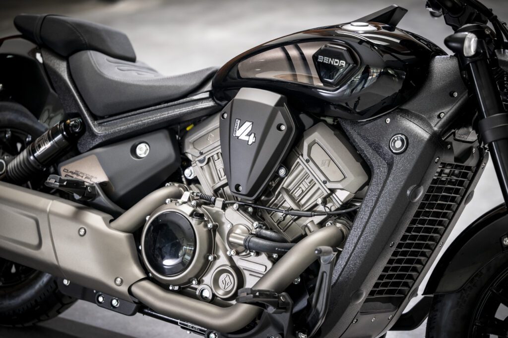 Este bloque en V de cuatro cilindros entrega 47 CV a 9.500 rpm y un par motor de 42 Nm, ofreciendo el carácter y sonido característicos de los cuatro cilindros en uve. Para gestionar el calor en paradas prolongadas, cuenta con un sistema que desconecta automáticamente la bancada de cilindros trasera. La potencia se transfiere a la rueda mediante una correa dentada Continental y una caja de cambios de seis marchas con embrague antirrebote.