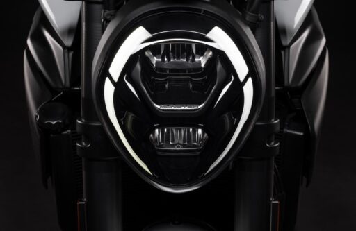 El faro delantero, que en el diseño de las motocicletas es el verdadero rostro de la moto, es totalmente LED, con un aspecto robótico y moderno que recuerda varios elementos estilísticos de la gama Ducati. Los paneles laterales se conectan al asiento, que es más estrecho y 5 mm más bajo (815 mm en total) para facilitar el apoyo de los pies en el suelo, y desvían el aire caliente del radiador hacia el exterior, mejorando el confort térmico. En la parte inferior de los paneles, el escudo Ducati está flanqueado por las coordenadas de la histórica fábrica de Borgo Panigale.
