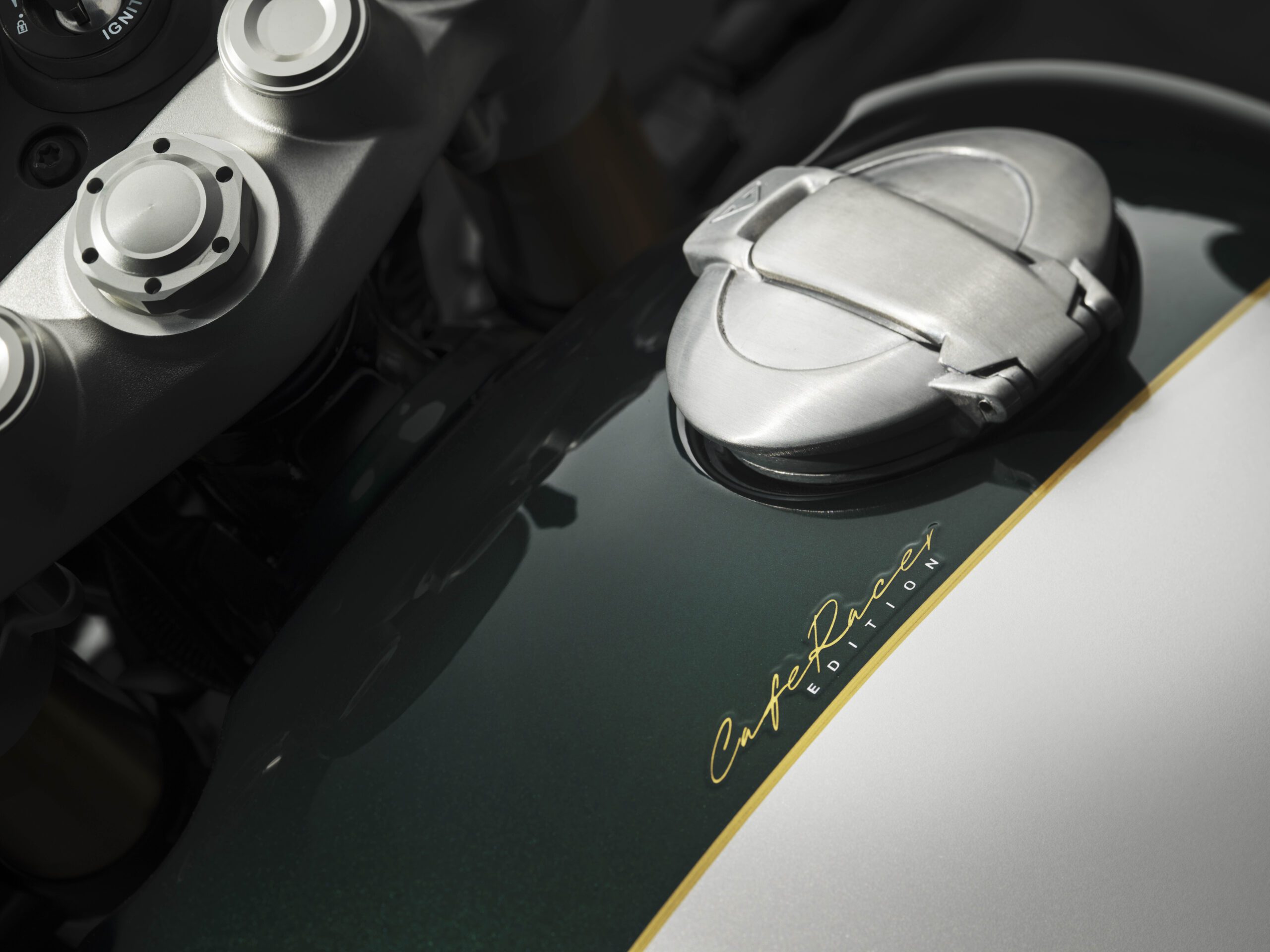La precisa línea en Empire Gold aporta un detalle artesanal de alta calidad y define la transición entre colores, mientras que el gráfico «Cafe Racer Edition» aplicado en la parte superior del depósito, también en Empire Gold, refuerza una clara sensación de exclusividad. La temática bicolor continúa en el colín, acabado en Competition Green con detalles en Aluminium Silver y una línea en Empire Gold, que proporciona continuidad visual a todo el conjunto.