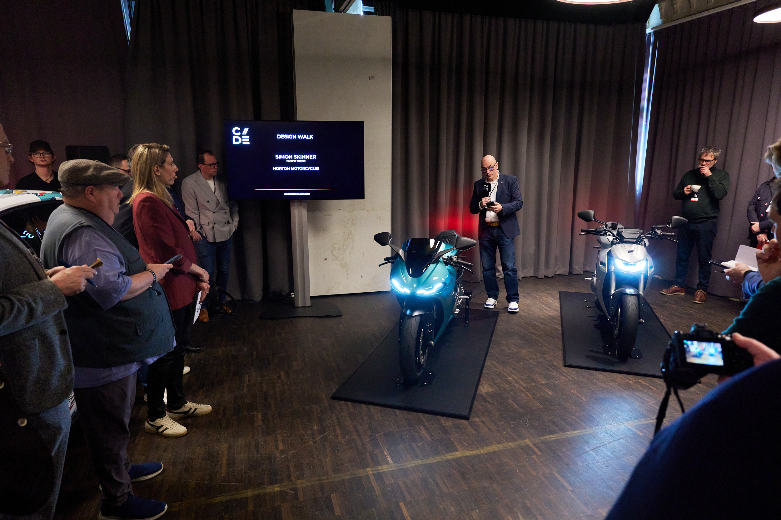 Durante el evento, Simon Skinner, responsable de diseño de Norton, lideró un design walk ante más de 100 invitados para explorar la conexión entre diseño automovilístico y motociclista. La presentación dejó clara cómo la influencia del diseño de las cuatro ruedas se puede aplicar a las motocicletas de alto rendimiento. Aunque a diferencia del automóvil, cada superficie en una Norton debe ser simultáneamente estética y ergonómica.