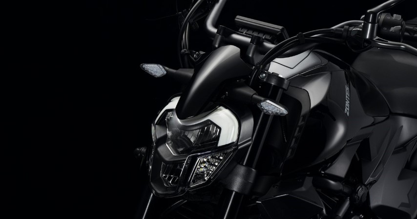 Por encima del faro se sitúan los intermitentes delanteros por matriz de diodos con forma de flecha y soporte de goma. Detrás, el piloto trasero se bifurca en dos en forma de ángulo para la luz de posición y, en el centro, la luz de freno. Los intermitentes traseros, a juego con los delanteros, se fijan al guardabarros pegado a la rueda que también soporta la matrícula y su correspondiente iluminación.