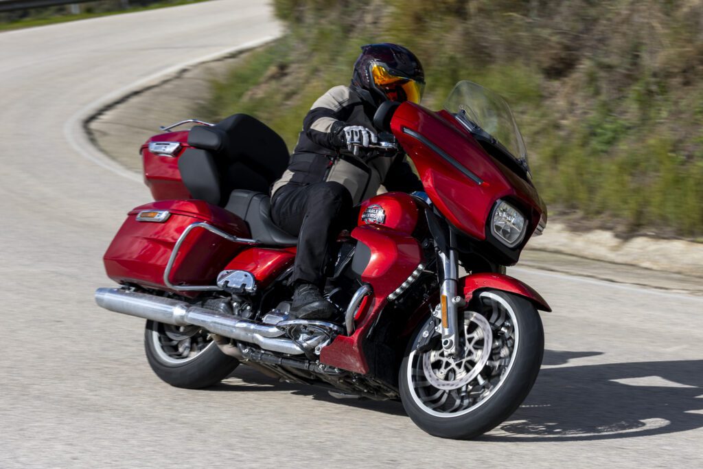 Los colores de ambos modelos de esta prueba contrastan con la profusión de cromados de su motor Milwaukee-Eight 117 y realza el exclusivo aspecto de esta potente máquina americana junto a las maletas rígidas, moldeadas por inyección con una capacidad de 144 litros para transportar lo necesario en cualquier viaje.