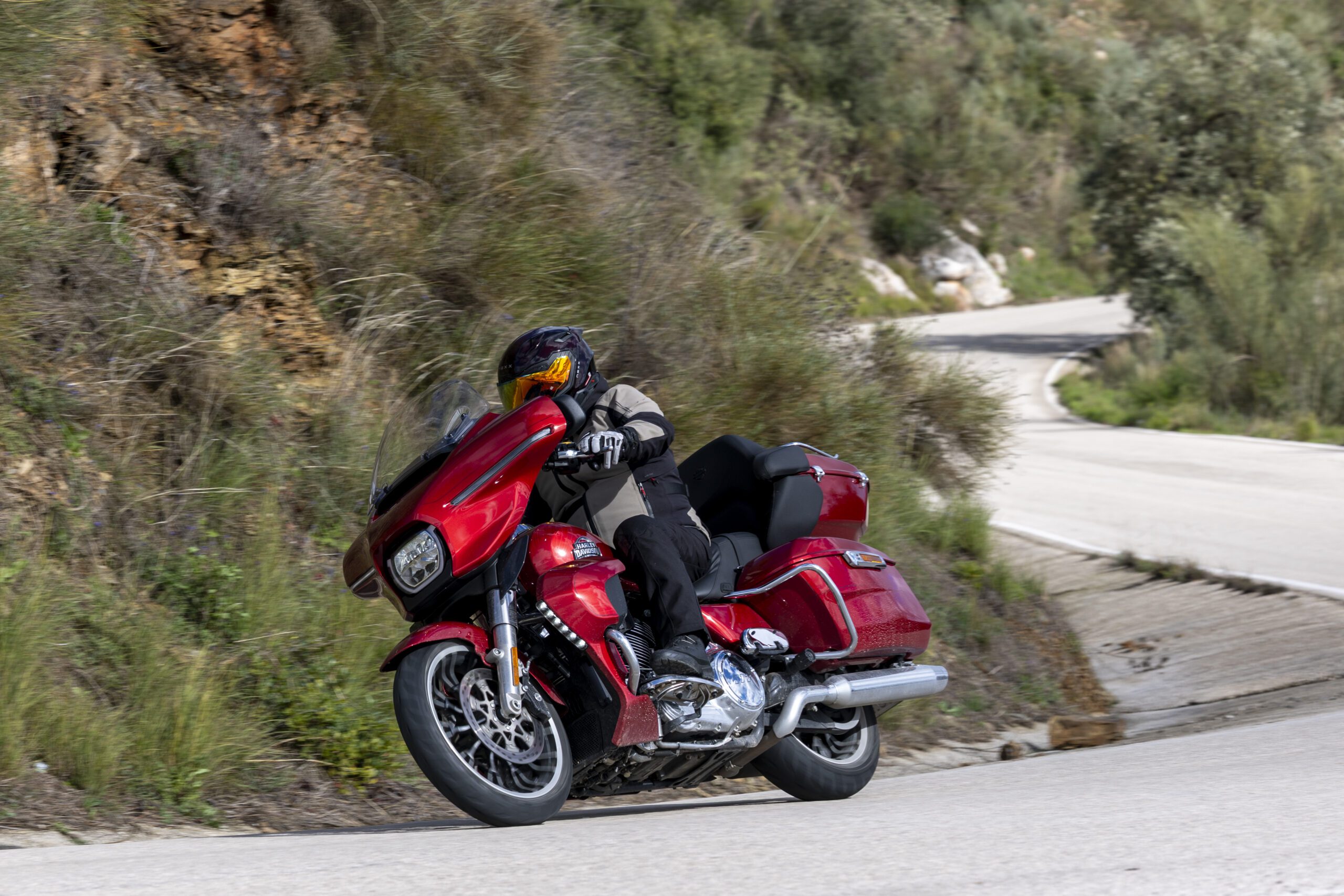 En curvas se comportan con mucha dignidad, para su envergadura y peso. Es fácil que rocen las estriberas, pero te recomiendo que evites hacer burradas. El par motor ayuda a ahorrarte algunos cambios de marcha y a la hora de detener estas Glide Limited los frenos son suficientemente potentes, incluso realizando un uso intensivo no llegan a fatigarse. Uno de los aspectos más destacables es la suspensión, sobresaliente. Cómoda aunque suficientemente preparada para soportar los esfuerzos a los que se ve sometida a grandes velocidades sin flanear en curvas.