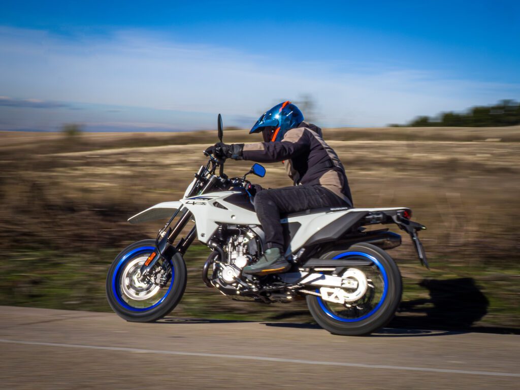 Con cifras máximas declaradas de 37,5 CV y 27,3 NM, la Suzuki DRZ-4SM debería tener suficiente potencia para la mayoría de los pilotos. Pero si tuviera que explicar brevemente el uso de la DRZ-4SM, lo describiría como suave y cómoda. Y es que su suspensión también es así. En su versión de fábrica, la configuración de su horquilla invertida y amortiguador KYB favorece la conducción en calle, aunque no es muy cómoda durante un largo día de uso.